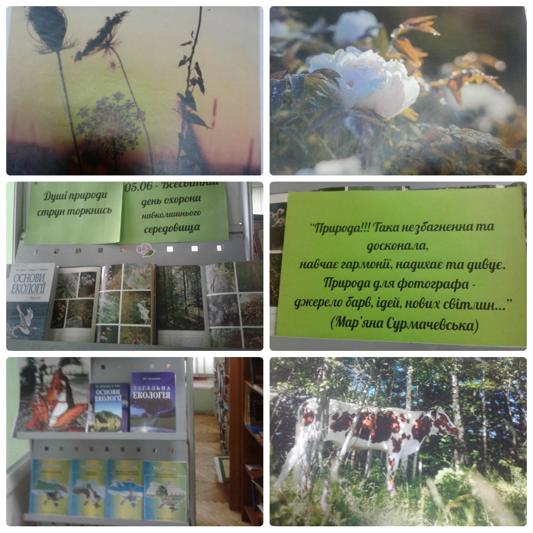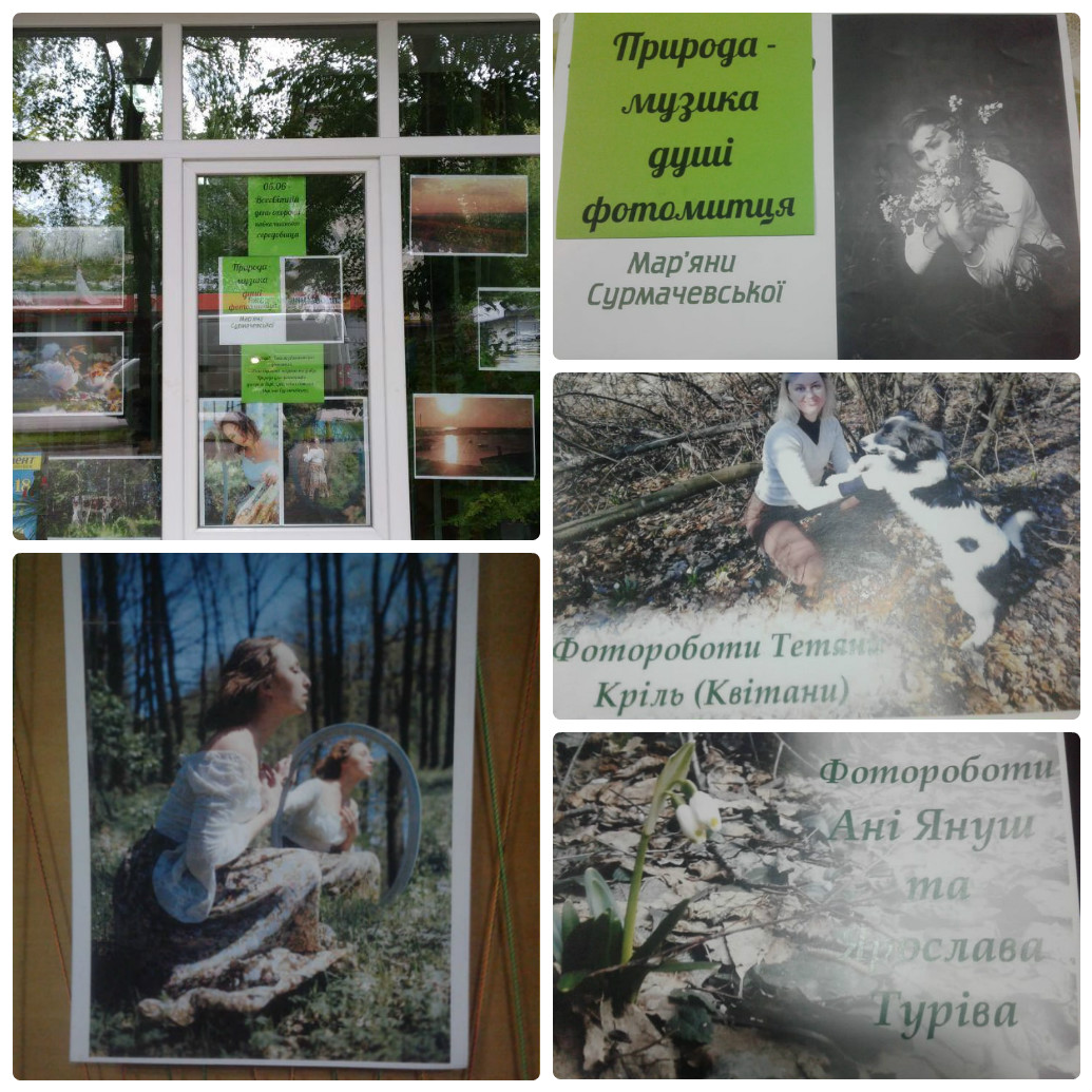 Позитивним доповненням до екофоторепортажу “Природа – музика душі фотомитця” , стала книжкова виставка “Душі природи струн торкнись”, на якій рядом з книгами екологічного характеру представлені графічні і фотоілюстративні роботи активістки бібліотеки Віталіни Майданської.