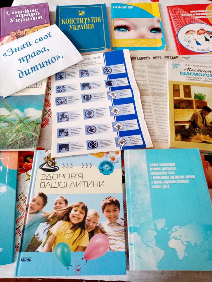 Детальніше з своїми правами діти можуть познайомитись, переглянувши книжкову виставку «Знай свої права, дитино». На якій представлені книги: «Збірник міжнародних правових документів, законодавчих актів і нормативних документів України з питань соціально-правового захисту дітей», «Конвенція ООН про права дитини», «Правовий статус дитини в українському суспільстві».